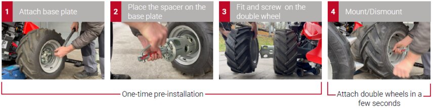 The double wheel system consists of a base plate and a spacer. The one-time pre-installation takes place in three steps: