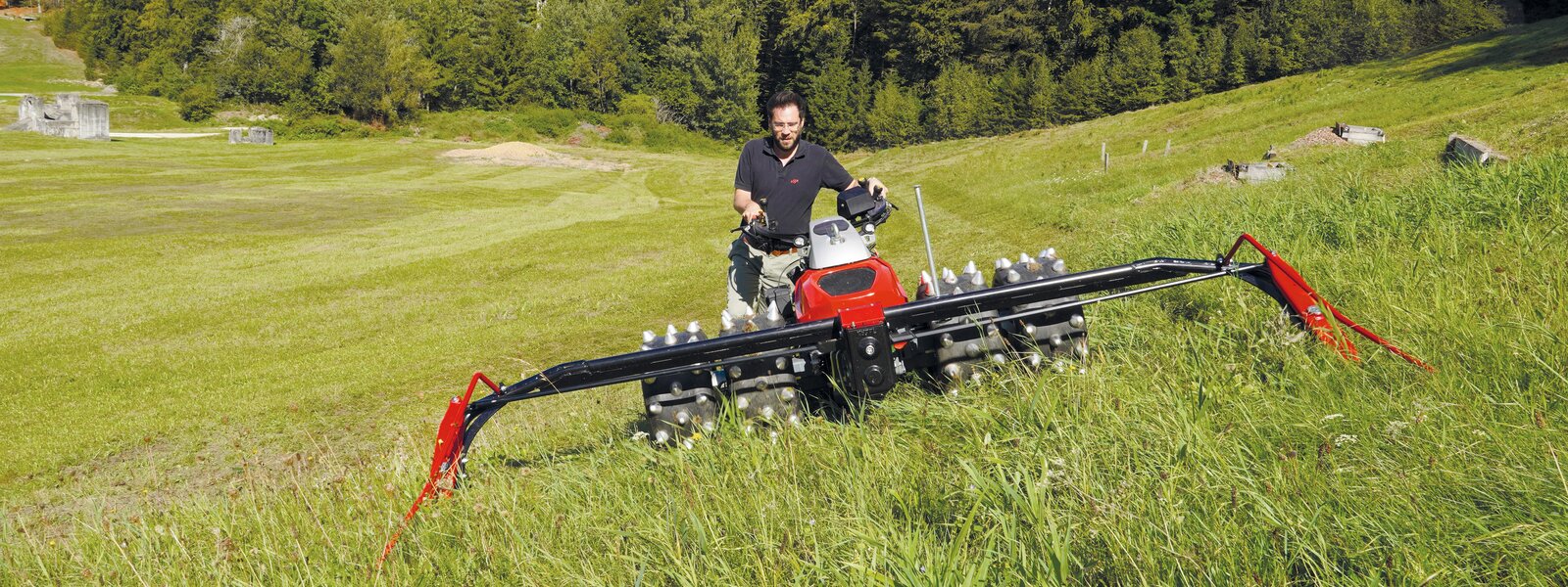 You can't reinvent the wheel?! This does not apply to our new double wheel system. Aebi offers a new, innovative double wheel concept for the Combicut motorised mowers in the large series. After a one-time pre-installation, the new system allows dual wheels to be attached in just a few seconds and removed again, for example for transporting the single axle machine.