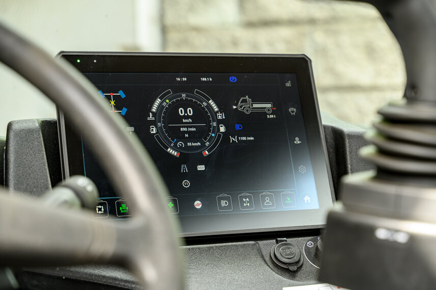 The 12-inch touch display in the TP 470 Vario opens up new possibilities and makes daily work easier. And yet the screen remains untouched during use. All settings are made on the display before driving, and it then serves as a source of information during operation. It is controlled via the tried-and-tested control lever and its buttons. Everything with just one hand.