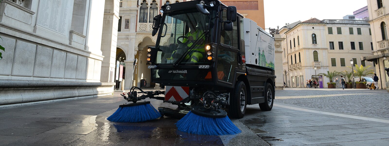 For cities the size of Padova, the contribution of zero-emission sweepers can be quite significant. Compared to a diesel-powered machine that operates six days a week in two shifts, an electrically powered Schmidt eSwingo 200+ reduces CO2 emissions by around 50 tonnes per year. Francesco Garbo, responsible for environmental services for the city of Padova, stated, "After more than a year of continuous use of the eSwingo200+, we can confirm that the performance is fully equivalent to that of the diesel version." The total operating costs are significantly lower and, thanks to an attractive range of attachments, the sweeper can also be used for washing, scrubbing, spraying, and other activities. Francesco also noted, "With the same performance, the vehicle is much quieter and produces fewer vibrations than the diesel version."