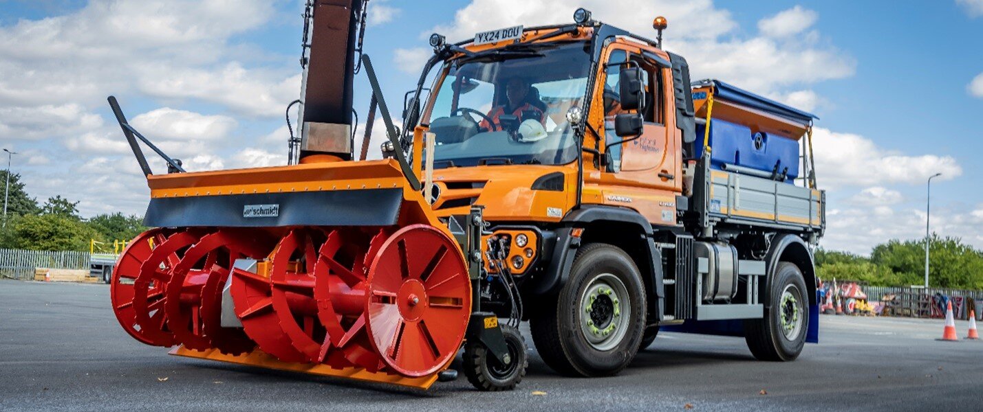 The highly flexible vehicles, mounted on Mercedes-Benz Unimog U427 chassis supplied by Newport, East Yorkshire-based South Cave Tractors, incorporate a high capacity Schmidt FS 90 snowcutter-blower, an Schmidt SNK 27 snow plough and a Schmidt Stratos III 2.5 m3 spreader, giving them highly flexible all-round winter functionality.