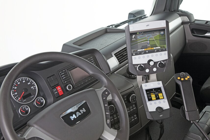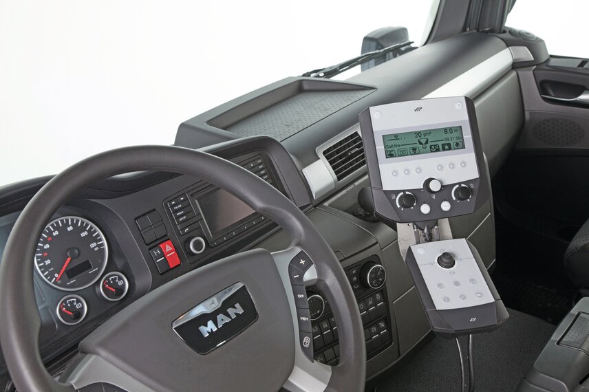Ergonomic operation of the attachments is ensured by the thumb joystick (EP control) or a separate joystick unit (ES control) which can be positioned within direct reach of the driver. An optional Bluetooth connection allows safe mounting and dismounting of the implements outside the driver's cab.