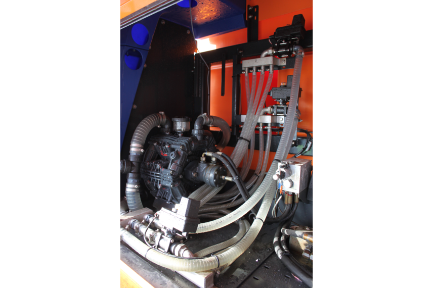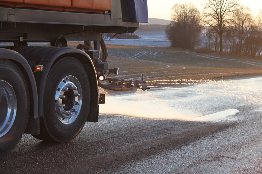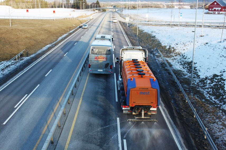 The heart of the dosing system is either a 295 litre/min diaphragm pump or a centrifugal pump (max. 700 l/min). The salt solution is applied from the rear of the vehicle via variable flow nozzles which ensure constant pressure and reduce mist formation. The spraying width can be individually adjusted to each lane down to the nearest metre.