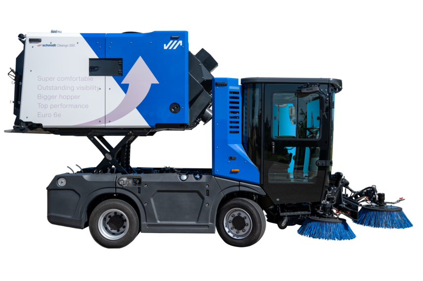 The new Cleango 550 has a hopper capacity of 5.2 m³. This is 10% larger than the predecessor model respectively. The larger system volume sets new standards in terms of performance and range. The Cleango 550 guarantees maximum sweeping performance with an extended operating radius. The basic model features a low tip. A high tip system with slide gate for emptying into containers is available as an option. The integrated scissor lift simultaneously moves the container upwards and closer to the container. This design ensures clean and safe emptying for the driver.