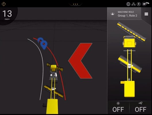 Al conducir con el sistema de asistencia al conductor, se muestra en la pantalla la ruta prevista, incluidos sus geoeventos. Los geoeventos indican el modo de funcionamiento correcto de la máquina y, si el conductor se sale de la ruta, unas flechas rojas muestran cómo volver a la ruta correcta. Cuando se opera con dos o más máquinas en una flota, los conductores también pueden beneficiarse del ajuste dinámico de la ruta. Esto significa que el sistema informa de cualquier desviación de una ruta definida o del funcionamiento de los vehículos que van delante, lo que permite a los siguientes ajustar su plan de funcionamiento y asegurarse de que no hay ningún vacío en la cobertura de despeje.