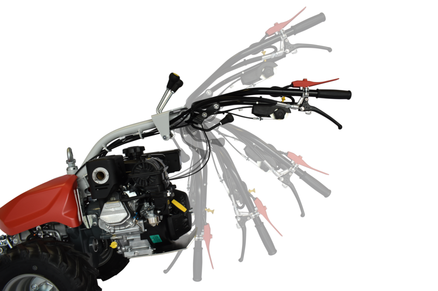 La dirección activa de la Combicut Aebi CC 120 y CC 130 también puede accionarse con el manillar bloqueado mediante palancas situadas a la izquierda y a la derecha de las empuñaduras. Esto garantiza que la máquina funcione en línea recta cuando se trabaja en pendientes pronunciadas con aperos pesados, sin tener que renunciar a la comodidad de la dirección activa. El manillar puede bloquearse lateralmente para repostar.