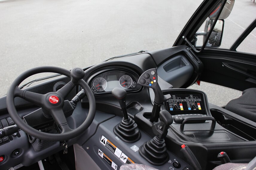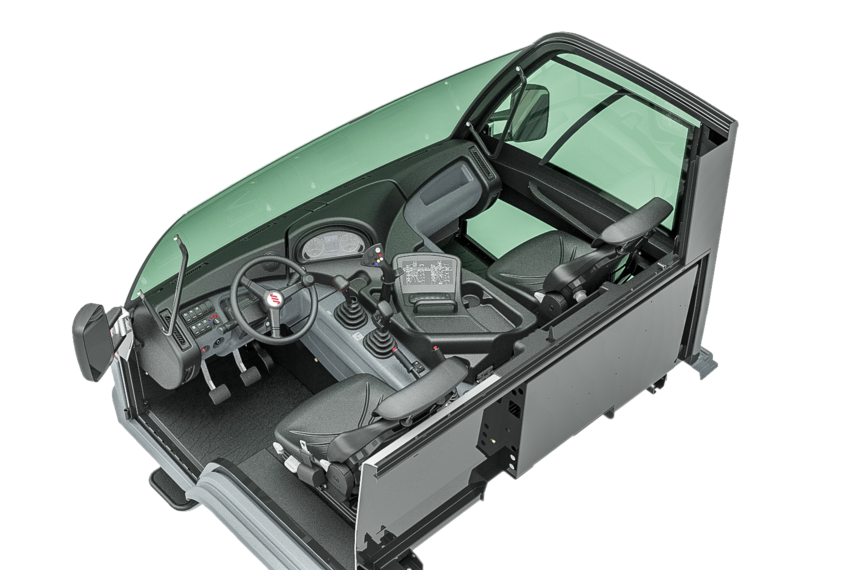 El vehículo se maneja cómodamente desde el asiento del conductor con pulsadores dispuestos de forma lógica y el intuitivo joystick montado en el centro. La moderna pantalla de control proporciona al conductor siempre la información más importante. Incluso fuera de la cabina, el conductor siempre tiene una visión clara de todo, gracias a las luces de trabajo instaladas de serie. El sistema de calefacción y aire acondicionado garantiza una temperatura agradable y unos cristales sin vaho. Las puertas de amplia apertura permiten un acceso fácil y seguro al asiento del conductor.