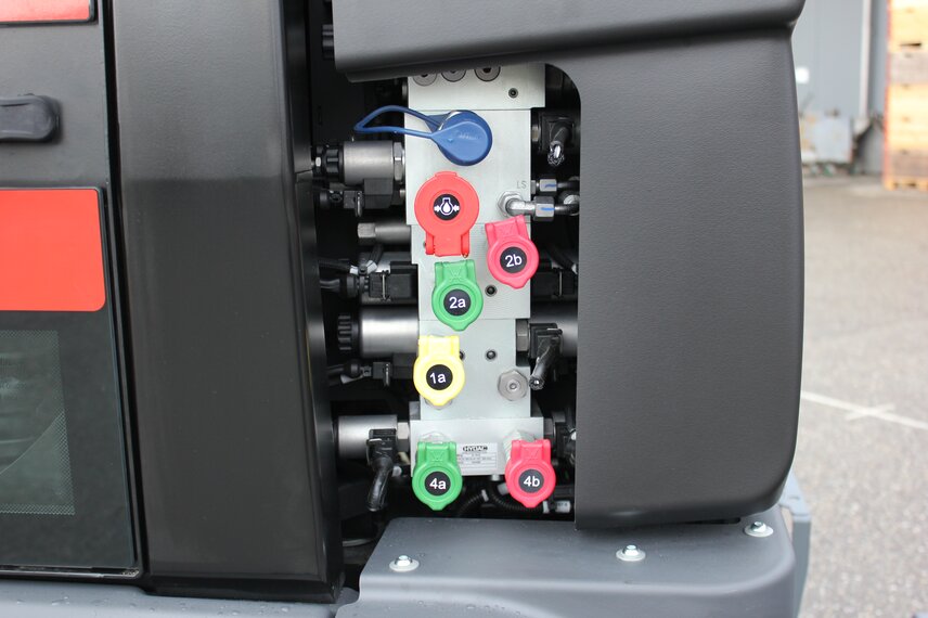 Las conexiones hidráulicas, perfectamente situadas, se encuentran a la altura óptima para el acoplamiento y desacoplamiento. Además de estas conexiones, los acoplamientos enchufables también pueden instalarse en la parte delantera, lo que aumenta aún más la versatilidad del vehículo.