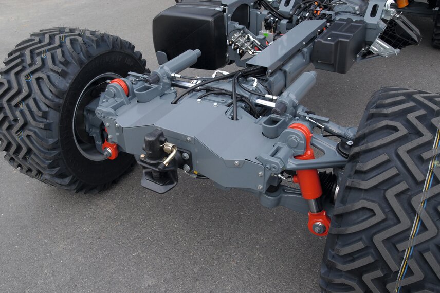 Tracción permanente a las cuatro ruedas a través del diferencial longitudinal con distribución de par 50/50. Los diferenciales longitudinal y del eje delantero y trasero son 100% bloqueables y se activan electrohidráulicamente de serie. Al apagar el vehículo, el diferencial longitudinal se bloquea automáticamente y el freno de estacionamiento tiene efecto en el eje delantero y trasero a través del cardán.