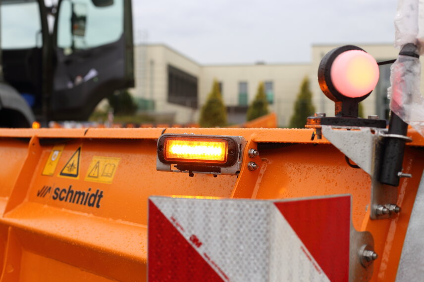 Improved visibility gained by integration of working side lamps with the orange flashing lights located horizontally on the plough blade.