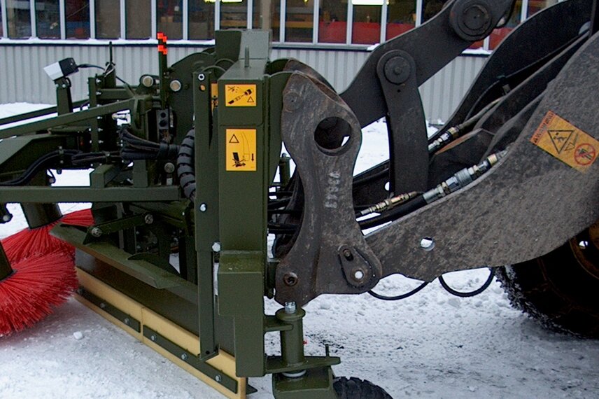 The RLP features a specialized blade and brush system that gently clears snow from around the lights. It is connected to the adapter frame and hydraulics of the carrying vehicle. While the front blades clear most of the snow to the side, the two adjustable, rotating brushes clear the runway lights while the rear plough blades remove the remaining snow. The adjustable distance between the brushes and the angle of attack enable different plough geometries. Four castor wheels support the frame when driving over obstacles and extend the service life of the cutting edge.