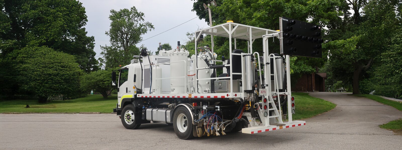Designed with operator safety and convenience in mind – The truck features multiple forms of egress, including rear steps with anti-skid material for safe access to the rear operator area. A 12" wide rear bumper provides space for mounting optional equipment such as toolboxes, hose reels, and paint manifolds. Multiple access ladders and bolt-down railings ensure safe operation and allow easy removal and replacement for servicing. The striping platform is available with diamond tread plate or smooth surface with tread tape, and can be configured in steel or aluminum to meet specific requirements.