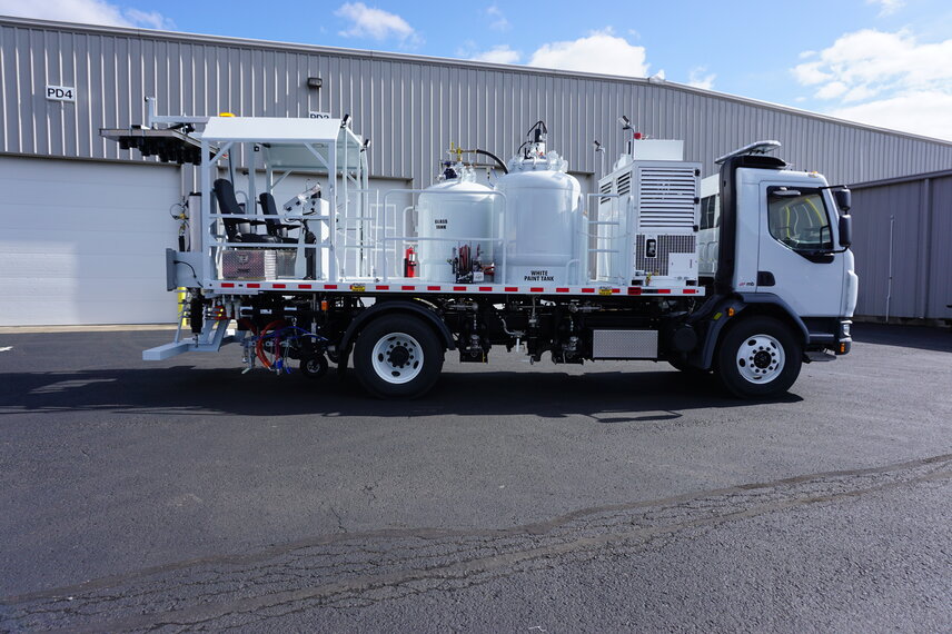 Choose from Peterbilt, Isuzu, Mack, Autocar, Battle Motors, Freightliner, or International chassis, available in single axle, single axle with lift axle, tandem axle, or tandem axle with lift axle configurations. Chassis are available with gas, diesel, or CNG fuel options to match your operational and environmental requirements. Each chassis is engineered to meet the specific needs of the striping machine, and dual steer options are available for enhanced maneuverability.