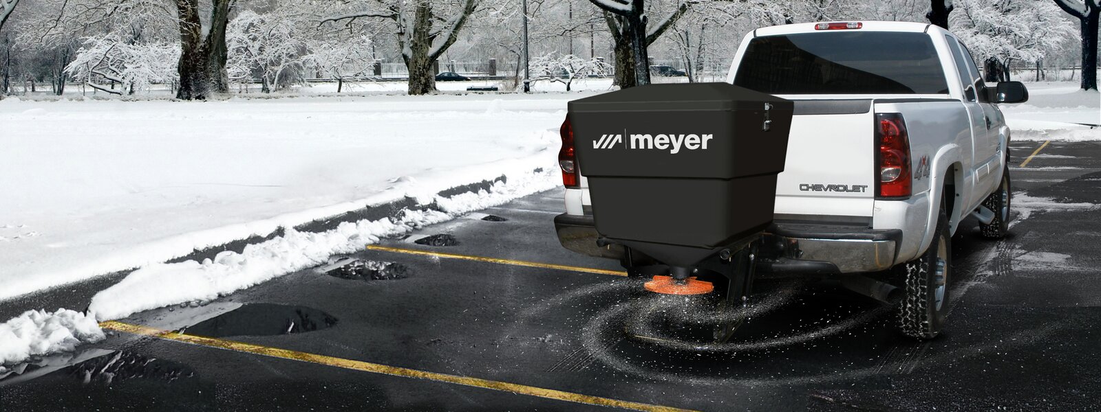 The Meyer Base Line spreaders are available in three sizes/capacities, 240 lbs., 400 lbs., and 750 lbs. The material hoppers features long-lasting, rust-proof, high-density polyurethane construction and a locking, moisture-resistant lid designed to prevent leakage of de-icing agent.
