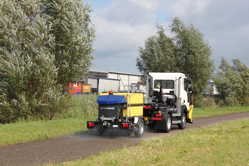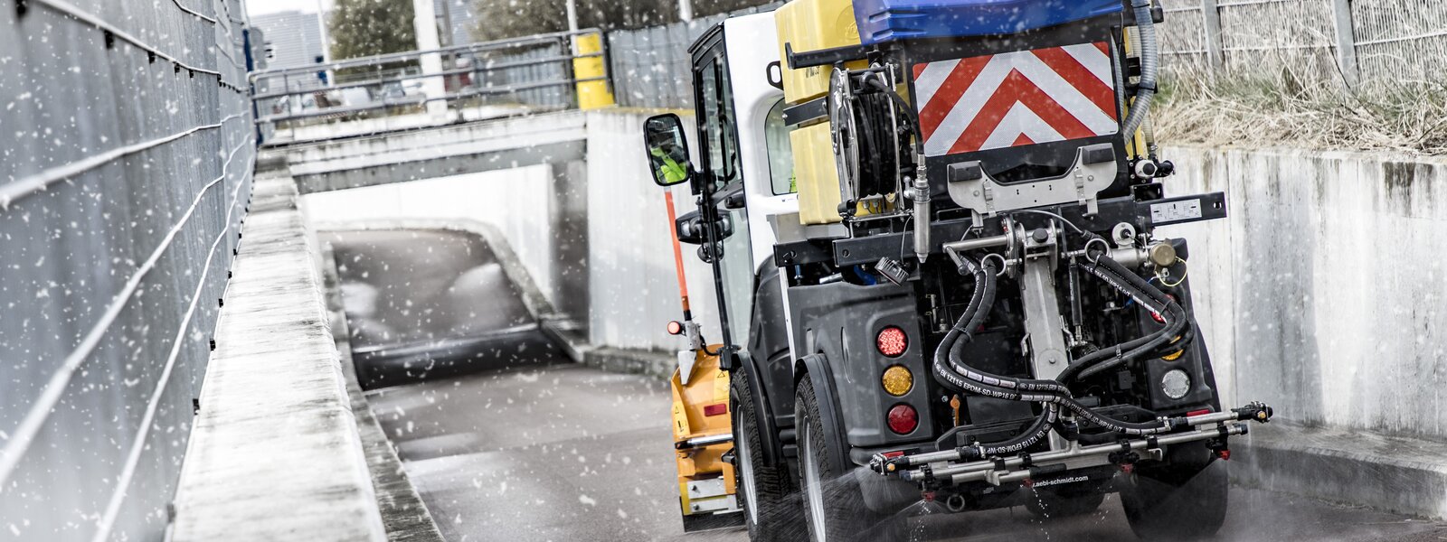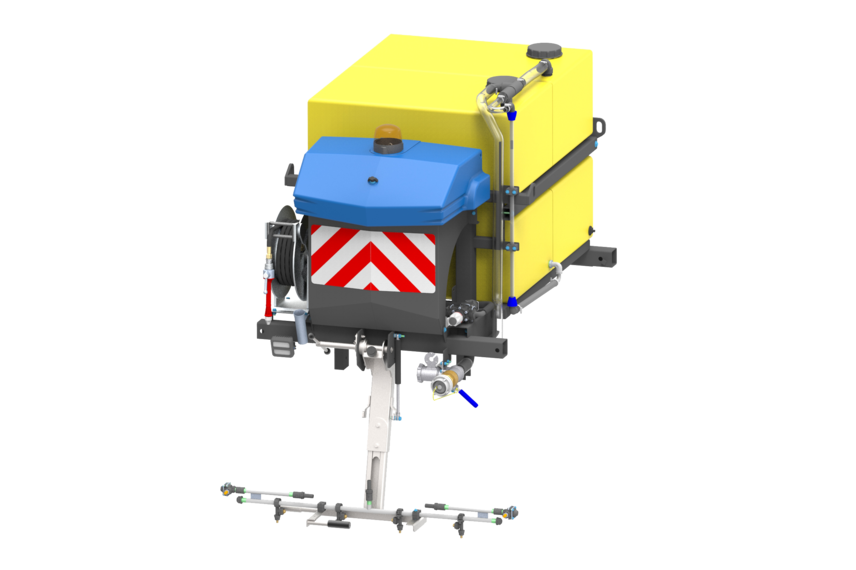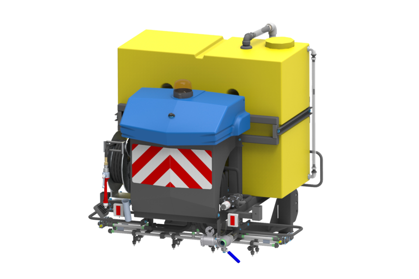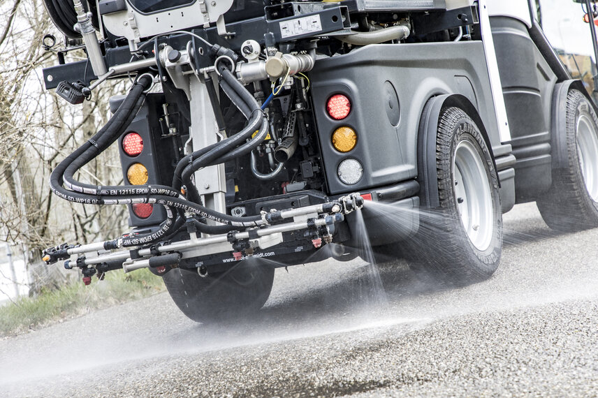 Un dosage tout aussi flexible que précis de l'épandage liquide est indispensable pour une lutte contre le verglas efficace. Par conséquent, la régulation du dosage a lieu dans un circuit fermé électro-hydraulique à capteur de contrôle. La quantité de produit liquide est de base asservie à la vitesse d'avancement via le signal du compteur de vitesse du véhicule, même avec un dosage minimal, une bonne répartition est garantie. Le liquide d'épandage est uniformément appliqué via une rampe d'épandage montée à l'arrière de l'équipement (en version sur plateau, cette rampe est même relevable avec assistance par vérin gaz). En fonction de la plage souhaitée de dosage et de vitesse, la saumureuse peut être équipée d'une seule ou d'une double rangée de buses. Ces buses basse pression à injection d'air garantissent un épandage sous forme de grosses gouttes du produit afin qu'il conserve son homogénéité et ses propriétés de déverglaçage - l'impact du liquide au sol est optimisé. Les buses d'épandage sont situées près de la surface du sol et assurent ainsi un jet uniforme, le moins soumis aux turbulences. Une pompe à membrane garantit que le liquide déverglaçant est efficacement transporté du réservoir PE au système de distribution. Trois sections de buses d'épandage permettent un réglage flexible de la largeur requise. La technologie éprouvée des buses garantit une distribution uniforme du liquide. Les buses disposées à proximité les unes des autres créent un spectre de distribution superposé et offrent ainsi plus de sécurité.