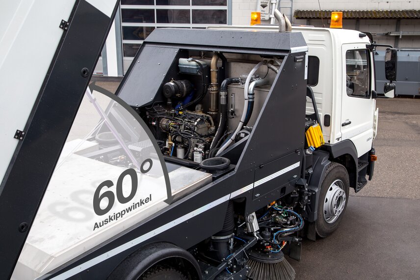 The rear suction unit enables full surface cleaning across the entire vehicle width. The high suction power and flow-optimised suction shaft ensure outstanding collection of debris – even persistent dirt and liquids. The flexible suspension, combined with a two-part suction vehicle, ensures that the suction nozzles ideally adjust to the swept surface, even when the truck is on a steep incline or uneven roads.