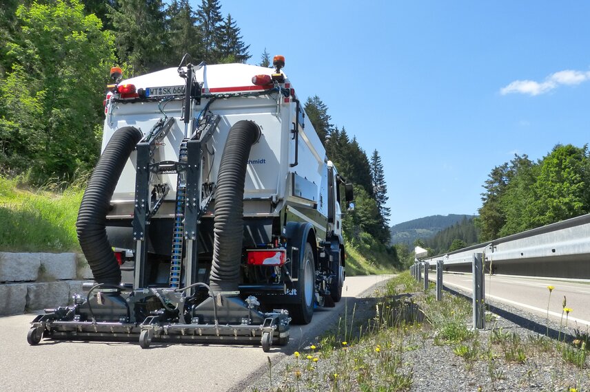 The transverse shift to the left or right enables lateral adjustment when driving straight ahead. The rear suction unit can therefore be positioned closer to the curb, while the corresponding pneumatic suspension also serves as lateral collision protection. The rear suction unit is not dependent on the type of truck and its operation is fully integrated into the ES control panel, enabling simple and easy control whilst driving.