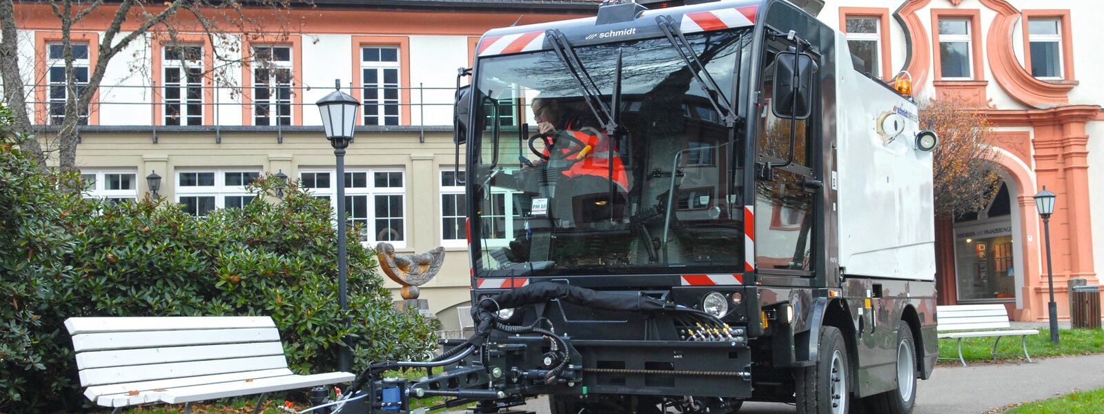 When designing the cabin, the focus was on ease of operation and ergonomics. Best visibility is through a spacious cab with windscreen that extends to the cab floor, while a window in the floor provides a clear view of the suction shaft and the disc brushes. Two large side mirrors also provide a perfect view of the working area and surroundings. The cab is equipped with high-quality noise and vibration insulation. At only 66 dB(A), the driver can concentrate better and perform tasks quickly and safely.