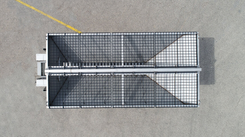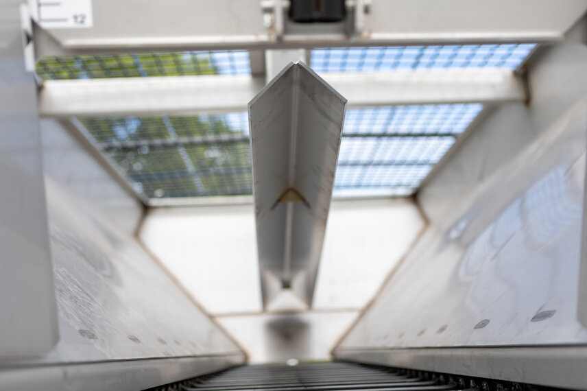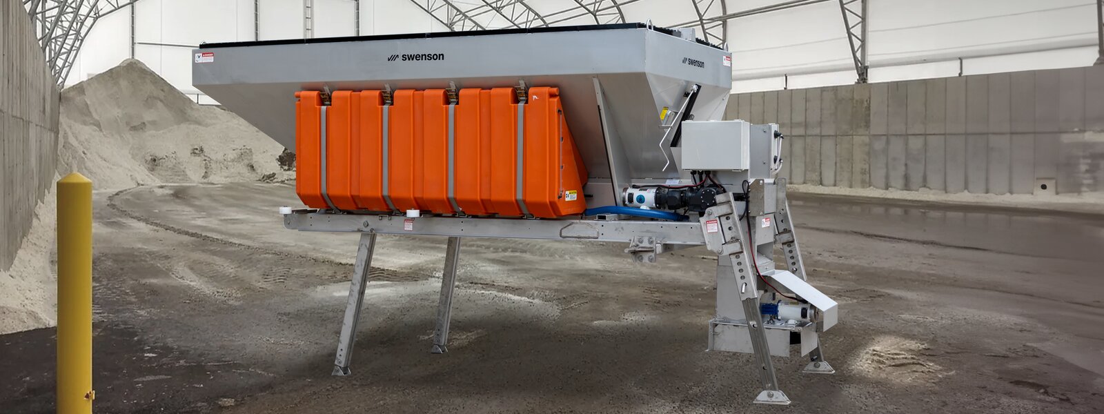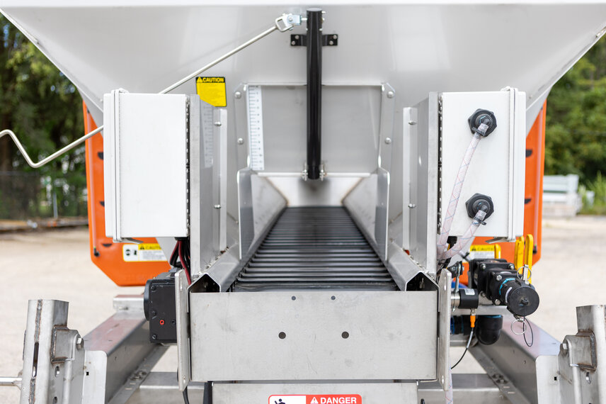 The maintenance-free stainless-steel hopper features 45° sloped sides for efficient material flow and an electrically driven chain-fed salt spreader. It also includes a standard inverted V design to reduce weight on the drag chain, ensuring optimal performance. Additionally, the setup includes an adjustable-height spinner extension and a standard swing-up spinner assembly for versatile operation.