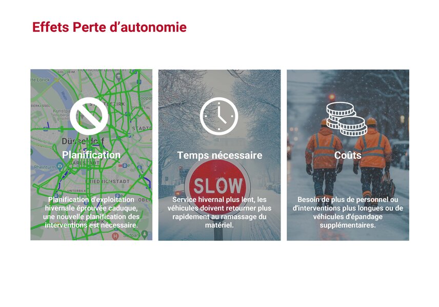 Les avantages du FS 50 sont évidents (voir encadré ci-dessous), mais le défi est le suivant : en raison de l'augmentation du rapport de saumure du FS 50, la distance d'épandage des épandeurs est raccourcie lors de votre intervention. Les véhicules doivent revenir plus souvent pour prendre du nouveau matériel, ce qui rend le service hivernal plus lent et moins efficace. La planification actuelle doit être entièrement repensée. On économise sur les besoins en sel, mais des coûts apparaissent à d'autres endroits. Un dilemme qui fait hésiter de nombreux responsables du service hivernal à passer au FS 50.