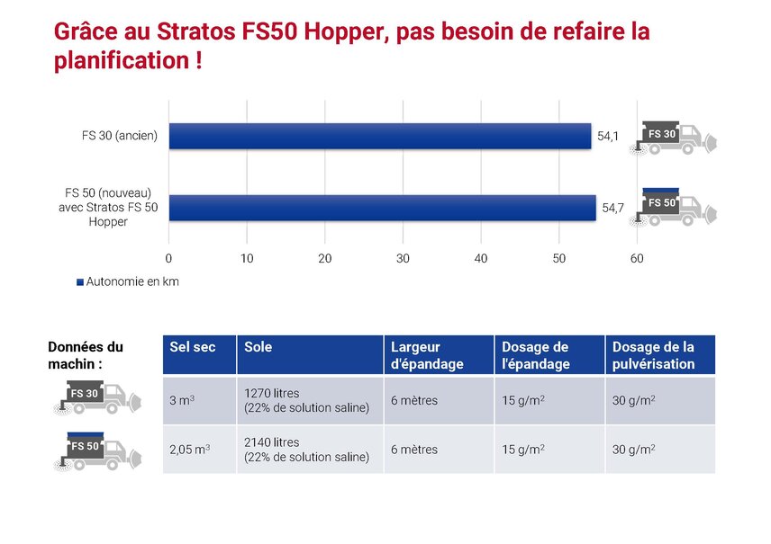 Votre planification éprouvée du service hivernal reste intacte ! Le FS 50 Hopper permet à vos épandeurs de parcourir la même distance qu'avec le FS30, voire plus. Pas de nouvelle planification des itinéraires et des cycles de charge, vous exploitez pleinement les avantages de FS 50 avec la flotte existante, car vous maximisez l'efficacité de vos véhicules. Si vous remplacez un véhicule d'épandage de votre flotte, commandez simplement le FS 50 Hopper en option avec les saleuses de la série Stratos.