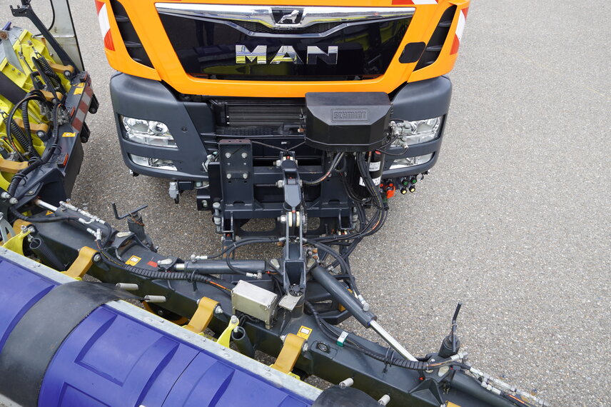 Le centre de gravité de la Tarron HP-2W se situe à environ 40 cm de la plaque de base du porteur. De sorte que son montage sur un camion 2 ou 3 essieux ne pose pas de problème, dès l‘instant qu‘il dispose d‘un essieu avant d‘au moins 9t. Pour une adaptation optimale de la lame sur différentes plaques de base véhicule, la plaque d’attelage est réglable en hauteur de sorte que la lame Tarron puisse être montée sur toute plaque de norme DIN Taille 3 ou 5, universelle F1 EN 15 432, suisse ou autrichienne.