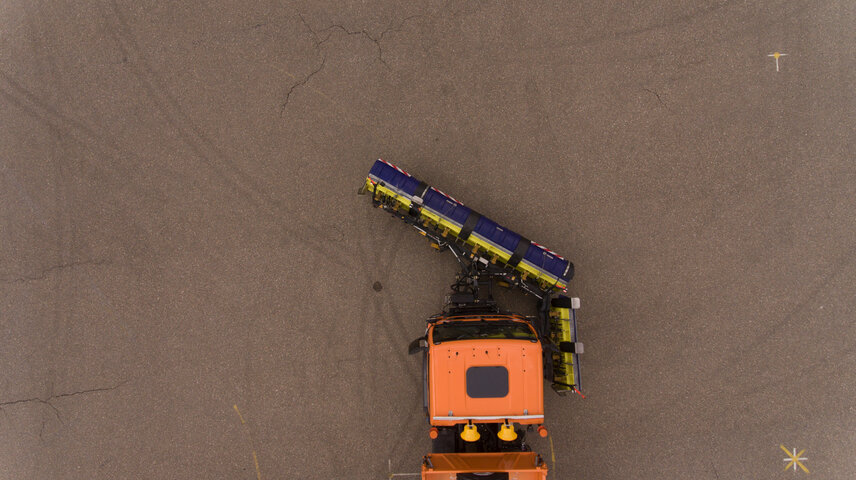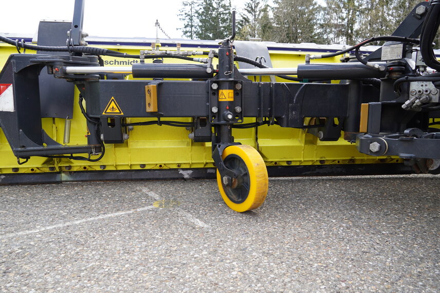 Une protection hydraulique contre les collisions pour les panneaux d‘extrémité escamotables est déjà intégrée dans le bloc de hydraulique de distribution de la lame standard et empêche toute surcharge sur ces panneaux. Toutes les fonctions hydrauliques sont exécutées via le bloc hydraulique optimisé sur la lame. Trois capteurs d‘angle contrôlent en permanence la position des panneaux d‘extrémité pour éviter toute collision avec le porteur. La largeur de travail enclenchée est systématiquement repérée par les différents feux de signalisation / gabarit LED.
