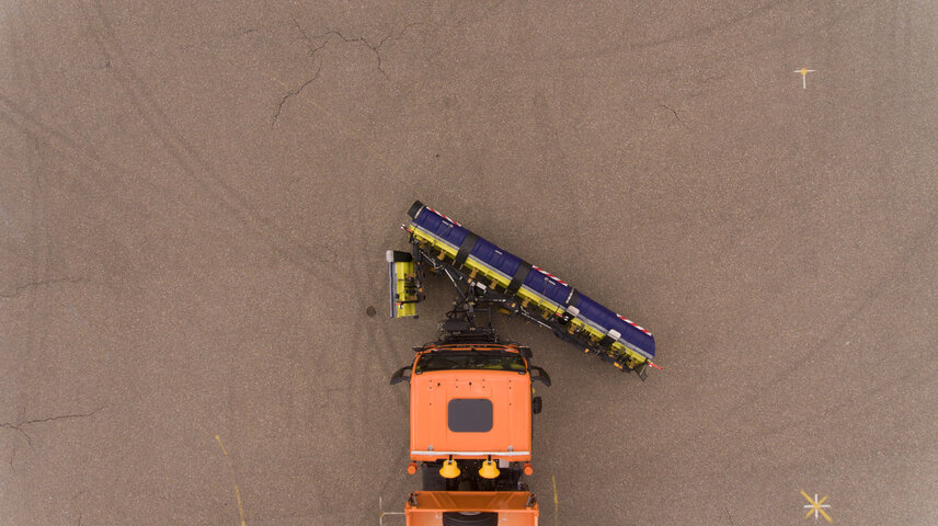 Grâce à leur accrochage indépendant au châssis via 4 bras rigides articulés, les 6 panneaux de lame y compris ceux d‘extrémité escamotables s‘adaptent de manière optimale au profil de la route et restent toujours en position de travail. La fermeture ou l‘ouverture des panneaux d‘extrémité offre différentes largeurs de travail.