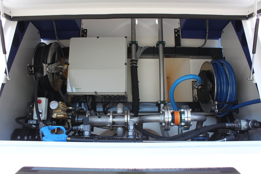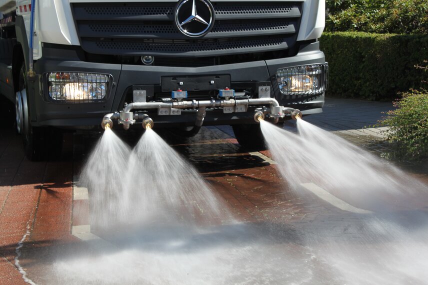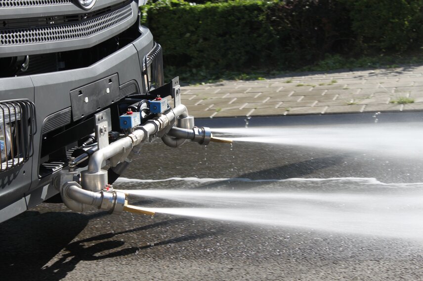 The beating heart of the dosing system is a centrifugal pump with a capacity of 330 litres per minute which pumps water from the tanks to the nozzles. Mounted at the front of the vehicle is a stainless steel spray bar with flat-jet nozzles which can be adjusted separately to create an optimal spray pattern for every situation. The spray pattern is adjusted by two electric motors, while the spraying width can be varied between three and 11 metres. In addition, a spray lance with 15 metre hose is mounted in the pump unit compartment.