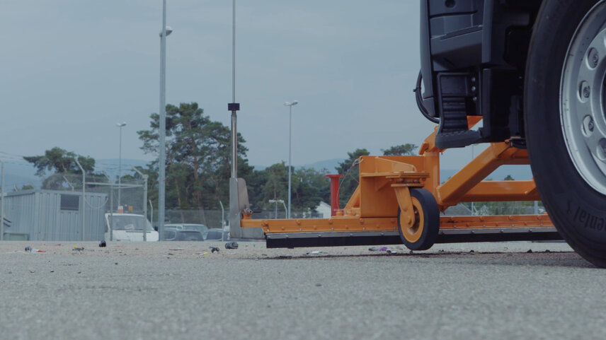 The PMB 2400 consists of four components: the magnet system, the top cover of the magnet system, two parallelograms with lifting and lowering cylinders and the equipment plate. The magnet system used in the PMB 2400 is very powerful and user-friendly. The strongest magnetic fields are directed downwards, while the magnetic fields to the side and upwards are significantly weaker, ensuring it complies with appropriate safety limits. The permanent magnetic beam is guided evenly over the traffic surface by two wheels. It reliably picks up magnetic objects at a working width of 2,400mm and a field density of approximately 405 Gauss, at a ground clearance of 100mm. The PMB 2400 is attached to the vehicle plate of the carrier vehicle by a quick-change system and can be attached or removed within a few minutes on size three and size five vehicle plates.