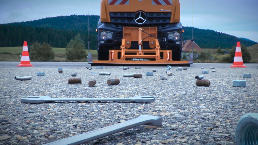 Magnetisable foreign parts are attracted when the PMB 2400 drives over them and remain firmly attached to a stainless steel rail, but the field lines of the magnet can still pass through it. The magnetic bar can be raised and lowered via the vehicle hydraulics or the independent electro-hydraulic system.