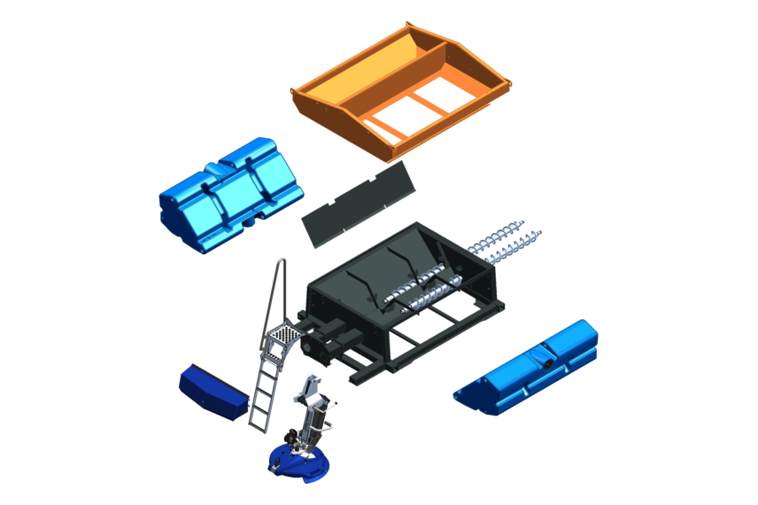- Het dubbele vijzeltransportsysteem voor een bijzonder lage trechterconstructie en een maximale benutting van de voertuigbreedte. Dankzij de nieuw verbeterde geometrie en de tegengestelde draairichting van de vijzels is het strooipatroon verder geoptimaliseerd. De vijzels van de dubbele trechteruitvoering worden afzonderlijk aangestuurd om verschillende doseringen van de twee strooimiddelen mogelijk te maken.
