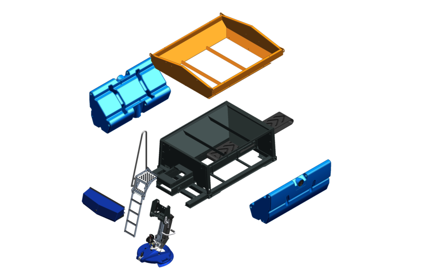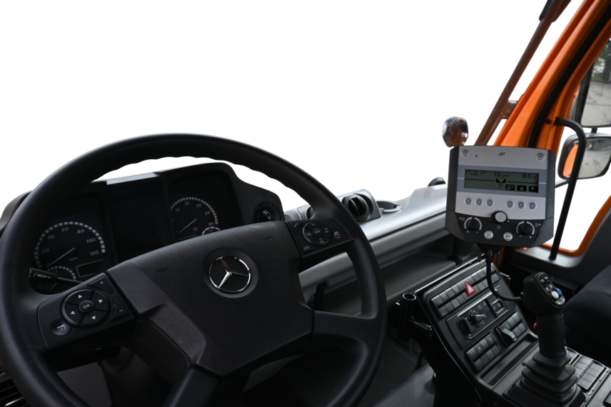 - Motoraandrijving: Het dieselunit is in de voorzijde van de strooier geïntegreerd, waardoor de benodigde extra opbouwlengte wordt gereduceerd.