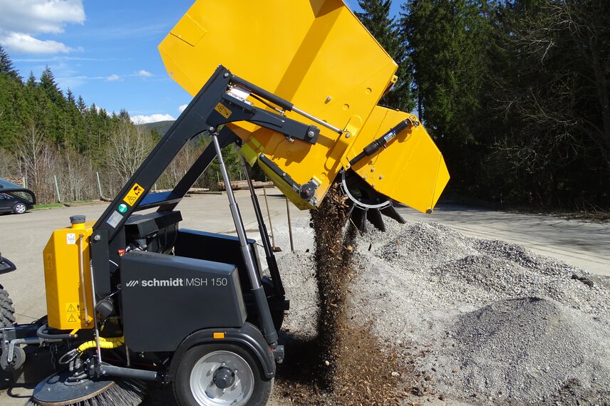 The MSH towed sweeper series has a steel hopper with a capacity of 0.7 m³ and a discharge height of 1,500 mm for the MSH 070 version and a capacity of 1.5 m³ and a discharge height of 1,800 mm for the MSH 150. In each case, the hopper is tipped hydraulically at the back.