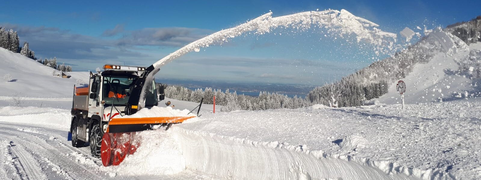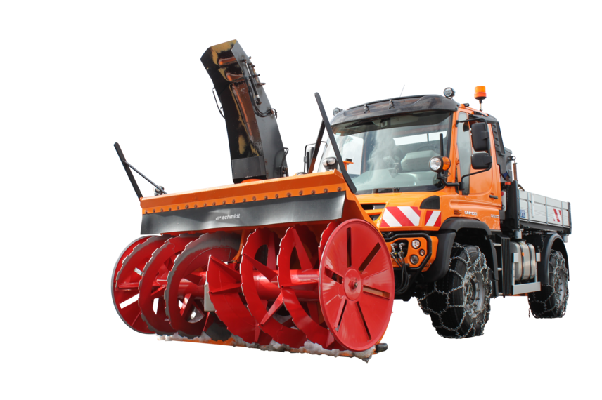 The snow cutter-blowers have a hydraulically rotating and foldable chute for targeted snow ejection. The snow is dynamically bundled in the chute to form a compact snow jet. The hydraulically operated ejection flaps change the casting range, while the chute turning device changes the direction of the snow jet. The snow can be thrown to the side via the chute or equally loaded onto a truck.