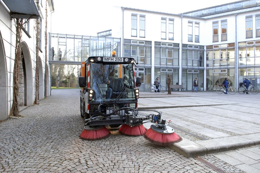 Zamiatarka MFH 250 dostępna jest z dwoma niezależnymi systemami zamiatania. Pchany system 2-szczotkowy ze szczotkami o średnicy 850 lub ciągniony system 3-szczotkowy ze szczotkami o średnicy 800 mm. Dostępny do wyboru zależny lub niezależny system sterowania szczotkami talerzowymi obsługiwany jest w obydwóch przypadkach w komfortowy sposób za pomocą elementów obsługi na drzwiach kierowcy. Prędkość obrotowa szczotek oraz docisk regulowane są w sposób bezstopniowy. W przypadku szczotek istnieje możliwość wyboru materiału - tworzywo sztuczne, stal lub materiał mieszany, a w przypadku ssawek możliwość wyboru typu - rolki lub płozy.