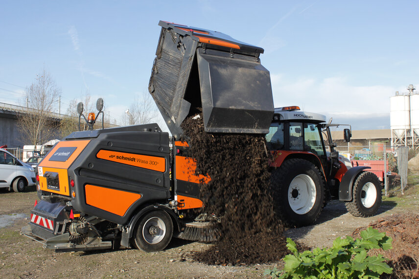Zamiatarka Wasa 300+ wyposażona jest w zbiornik stalowy na zmiotki o pojemności 3 m3. Wysokość opróżniania wynosi 1750 mm (opróżnianie na prawo). Zbiornik przechylany jest hydraulicznie - hydraulicznie wysuwana noga podporowa dodatkowo zabezpiecza maszynę przed przewróceniem. Zoptymalizowany kształt zbiornika (stożek) zapewnia bezpieczne i sprawne opróżnianie.
