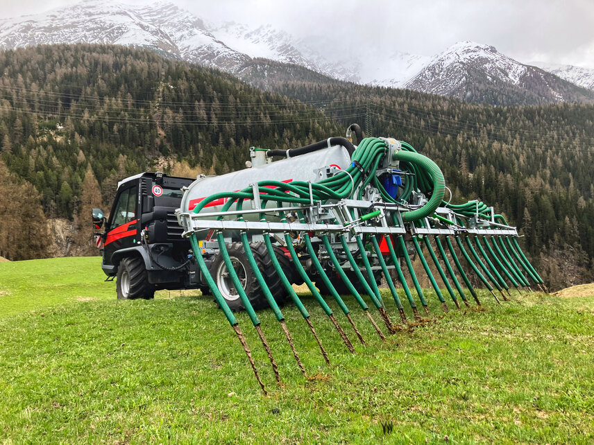 Spreading manure in alpine locations is a logistical and technical challenge. The growing season in mountainous areas starts late and is short. This requires precise timing on the part of farmers. Steep slopes and rough terrain make it difficult to use machinery, and many meadows are sensitive to soil compaction. Accessing the plots via narrow paths is also a challenge, and distributing the manure evenly over uneven surfaces is technically demanding.
