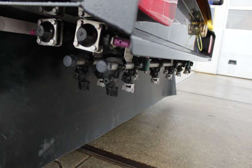 Система распределения подходит для использования всех распространенных противогололедных реагентов. Пластиковый бак объемом 2 500 л, оснащенный встроенными перегородками и индикатором уровня, обеспечивает значительный запас хода. Реле уровня автоматически отключает насос в случае переполнения бака. Заполнение бака осуществляется через заливную горловину или через С-образную муфту. Стационарная распределительная рейка оснащена одним или двумя рядами форсунок, а также форсунками увеличенной производительности для увеличения рабочей ширины. Подача реагента осуществляется диафрагменным насосом с производительностью 120 л/мин.