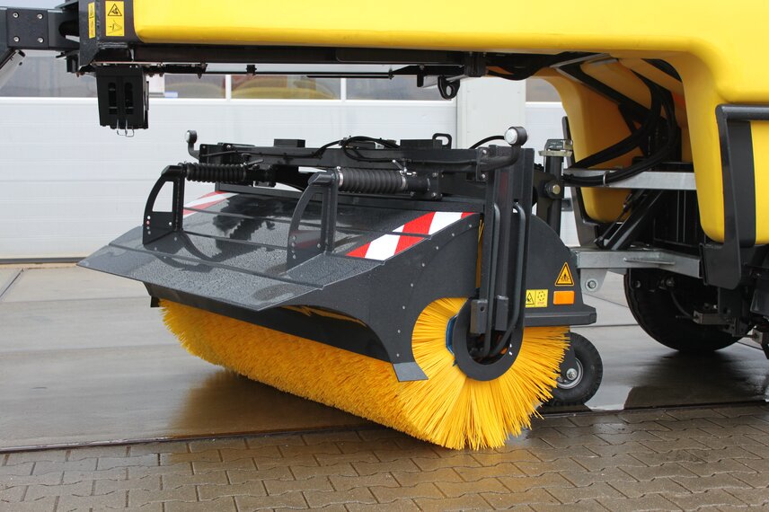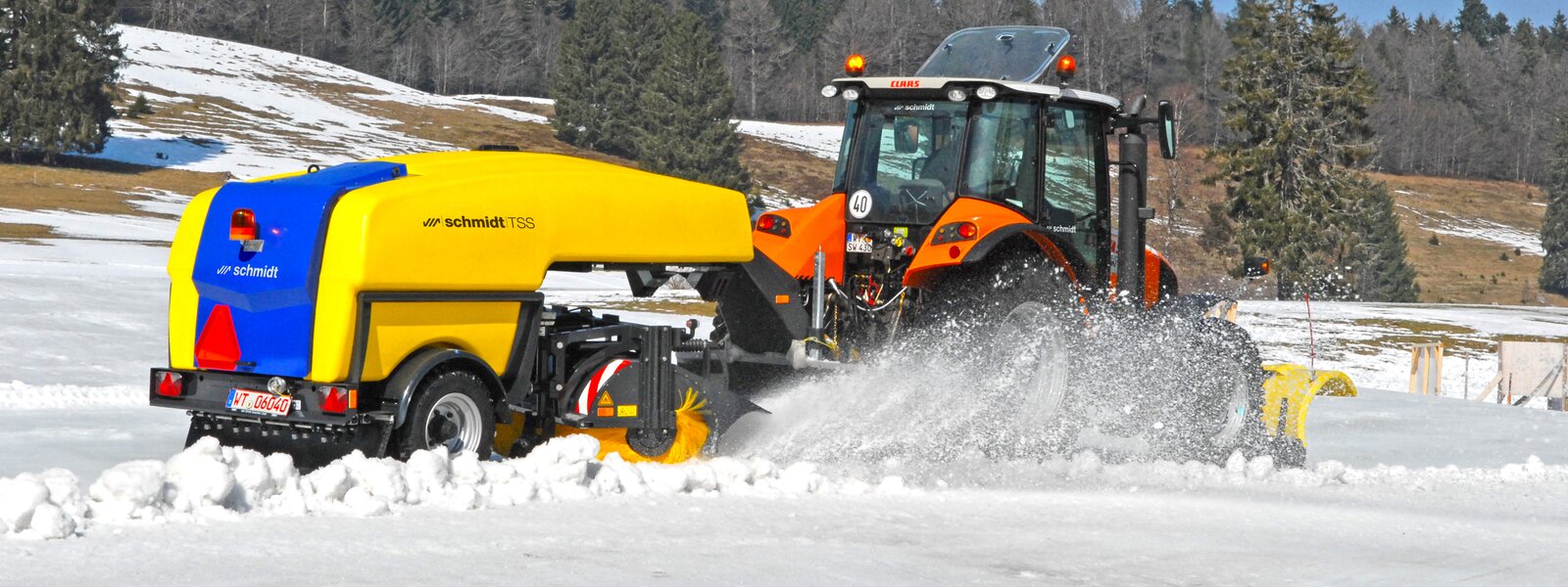 Прицепная подметальная машина TSS оборудована подметальным устройством и распределителем жидких реагентов для осуществления противогололедной обработки в три этапа. Сначала отвал убирает снег в сторону, затем щеточный агрегат сметает оставшийся снег и, наконец, дорожная поверхность обрабатывается жидким раствором соли.